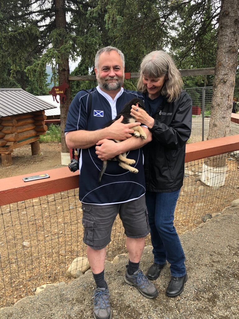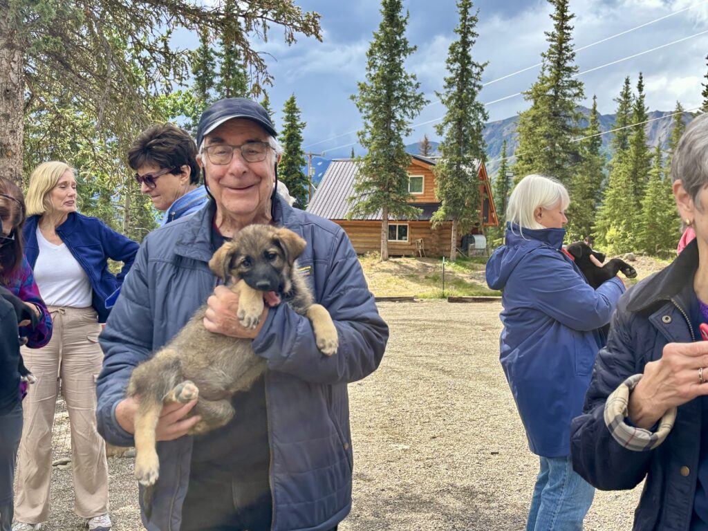 An Odysseys guest holds a puppy at Husky Homestead, the Iditarod sled dog kennel we visit on Alaska’s Untamed Wilderness.