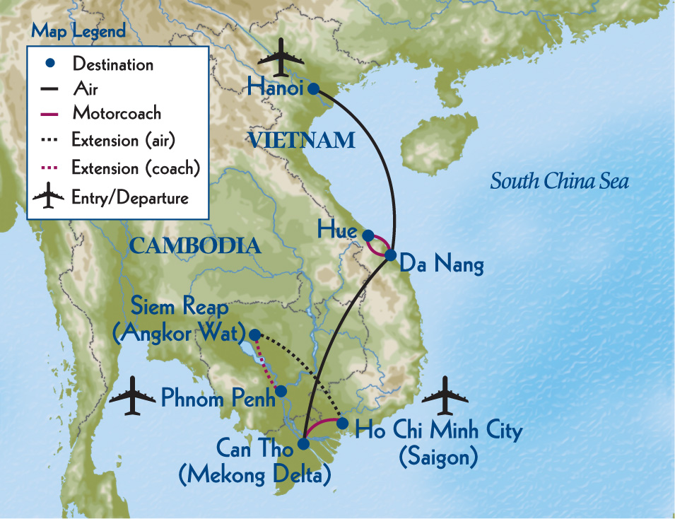 | 12 | Mekong Delta/Saigon B L B L Mekong Delta/Saigon Read More An hour-long coach ride this morning brings us to the upper reaches of the storied Mekong. Here we board motorized sampans for an up-close look at river life as we explore the maze of tributaries and inlets that lead to tiny settlements and villages populated by fishermen and farmers. After lunch together, we continue on by coach to Saigon (the name Ho Chi Minh City is used interchangeably). We reach our hotel late afternoon; dinner is on our own in this vibrant city. An hour-long coach ride this morning brings us to the upper reaches of the storied Mekong. Here we board motorized sampans for an up-close look at river life as we explore the maze of tributaries and inlets that lead to tiny settlements and villages populated by fishermen and farmers. After lunch together, we continue on by coach to Saigon (the name Ho Chi Minh City is used interchangeably). We reach our hotel late afternoon; dinner is on our own in this vibrant city. |